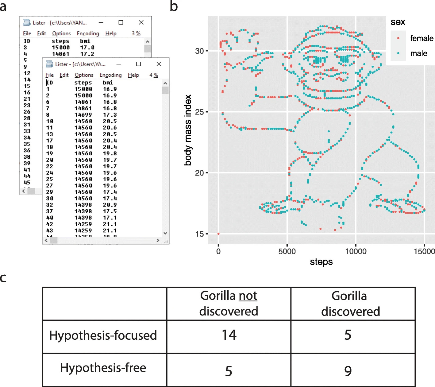 So they made up a dataset and asked students to analyze it. The dataset contained made-up data about men's and women's body mass index (BMI) and the number of steps they took.
