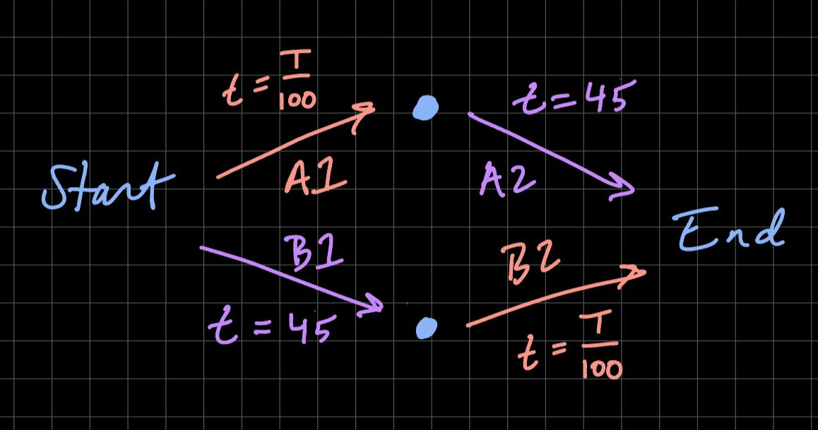 Suppose there are 4000 drivers going from start to end. They can initially choose to take routes: A1 -> A2 or B1 -> B2. The travel time for B1 and A2 is a constant 45 minutes (imagine a large highway with many lanes). The travel times for A1 and B2 is dependent on the number of cars on the road T, let's say T/100 minutes.