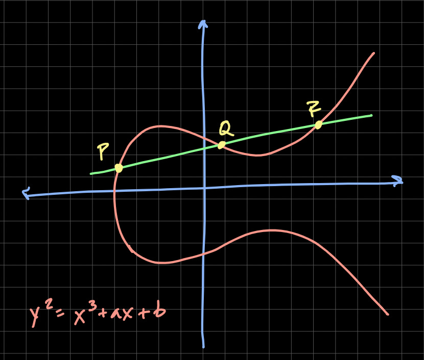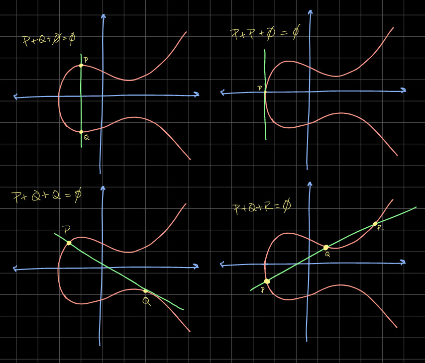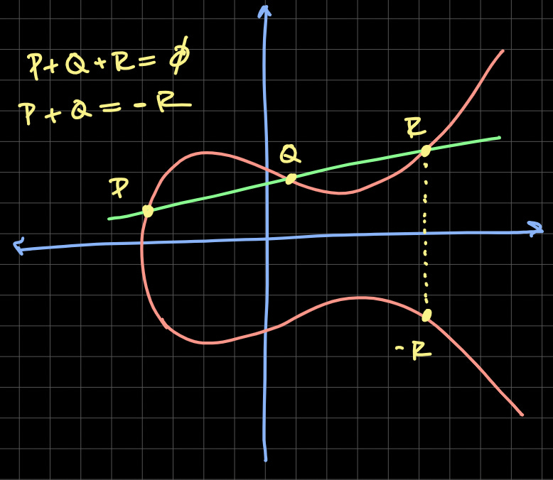 For a line that intersects three points, P + Q +R = 0, which means that P + Q = -R. Point 0 is defined as a "point at infinity" – an easy way to think about this point is to think about parallel railroad tracks that appear to intersect at the horizon.