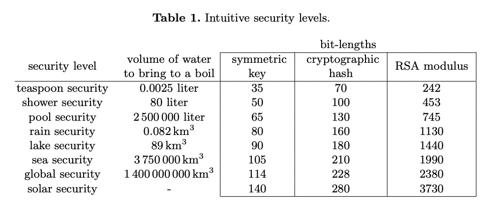 For a 242-bit RSA key, you could break the encryption with just enough energy to boil a teaspoon of water. For a 228-bit ECC-based key, you'd need enough energy to boil all the water on earth to break the encryption.