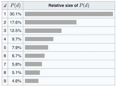 Benford's law: in many naturally occurring collections of numbers, the leading digit is likely to be small.
