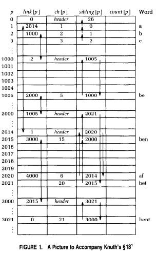 Knuth wrote a clever program in WEB, a language that combined Pascal and TeX. The algorithm incorporated a trie, interleaved 26-element arrays, and insertion-sort.