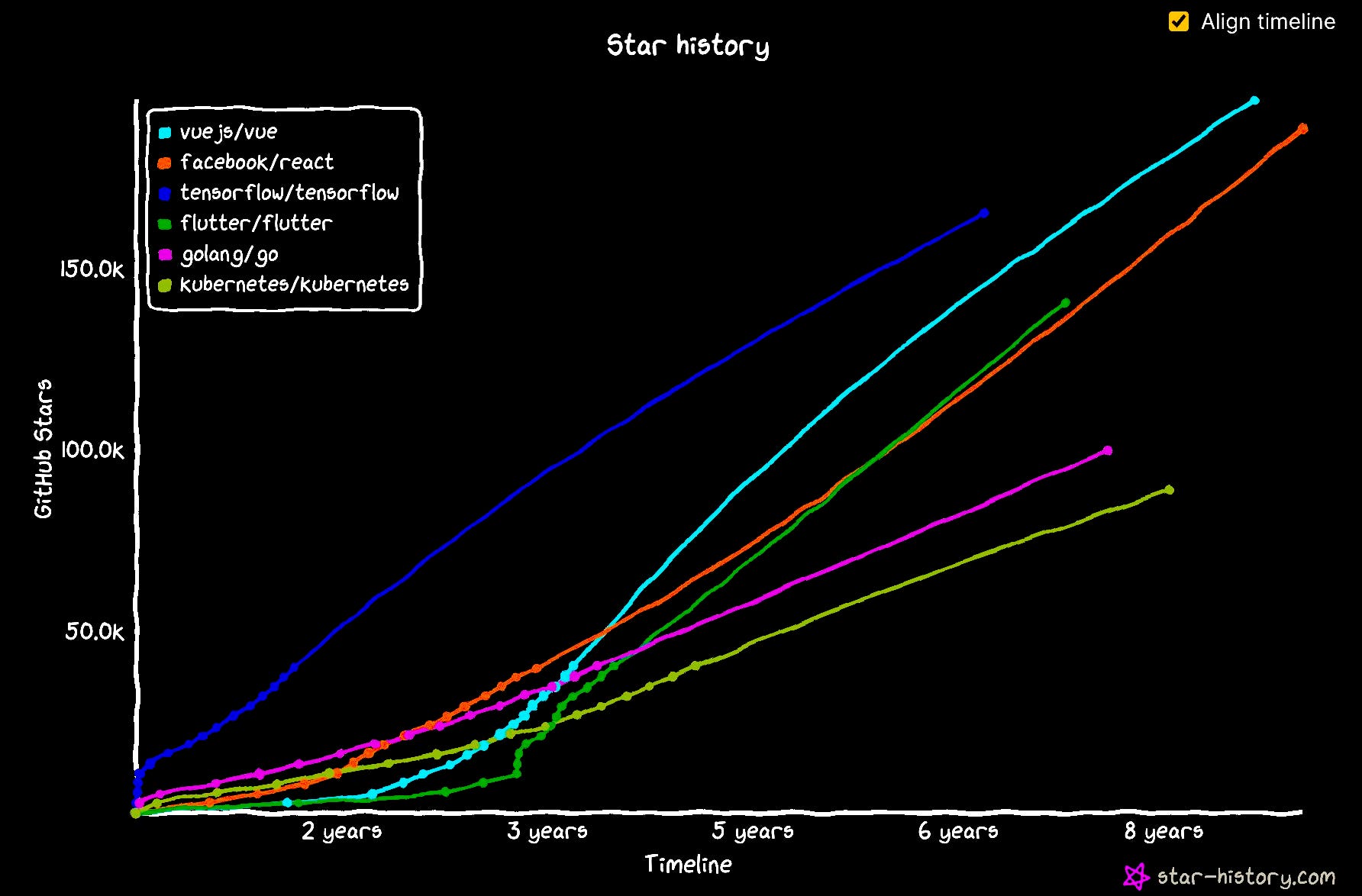 Star growth is correlated with the log of usage. For example, React has grown exponentially in the last five years, yet its stars are fairly linear.