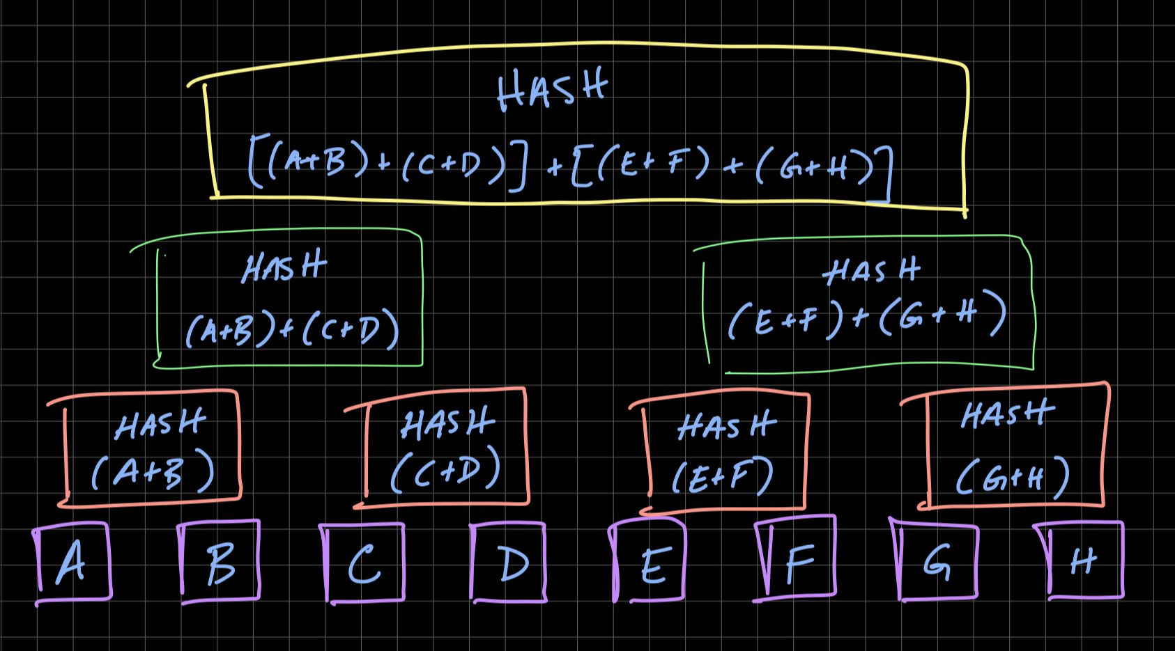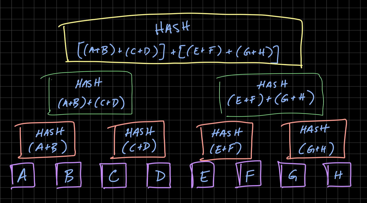 A Merkle tree is a tree of interconnected hashes. When one leaf node changes, the hash of each parent up the chain also changes, and ultimately, the root hash changes.