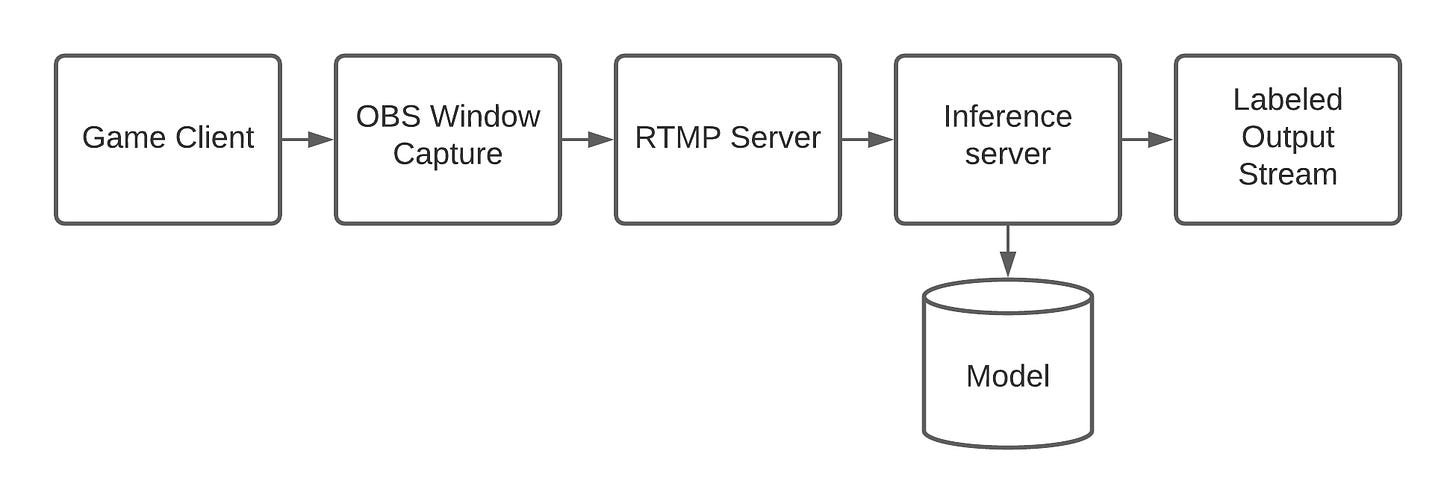 Once the model was trained, I needed to figure out how to run online inference. I ended up using OBS to capture the game window, streaming that to a local nginx server with RMTP. The inference server could then connect to that stream, run predictions, create bounding boxes, and output a labeled stream.