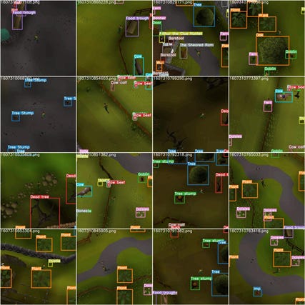 There are already ways to identify objects in game - but it requires code injection and Java reflection, both of which can be detected easily by the game's anti-cheating software. I chose to use some of those methods to collect the data. I collected about a hundred thousand in-game screenshots of labeled data with a bot programmed to walk around all of the in-game areas, switching the camera pitch and yaw and taking screenshots every few seconds.