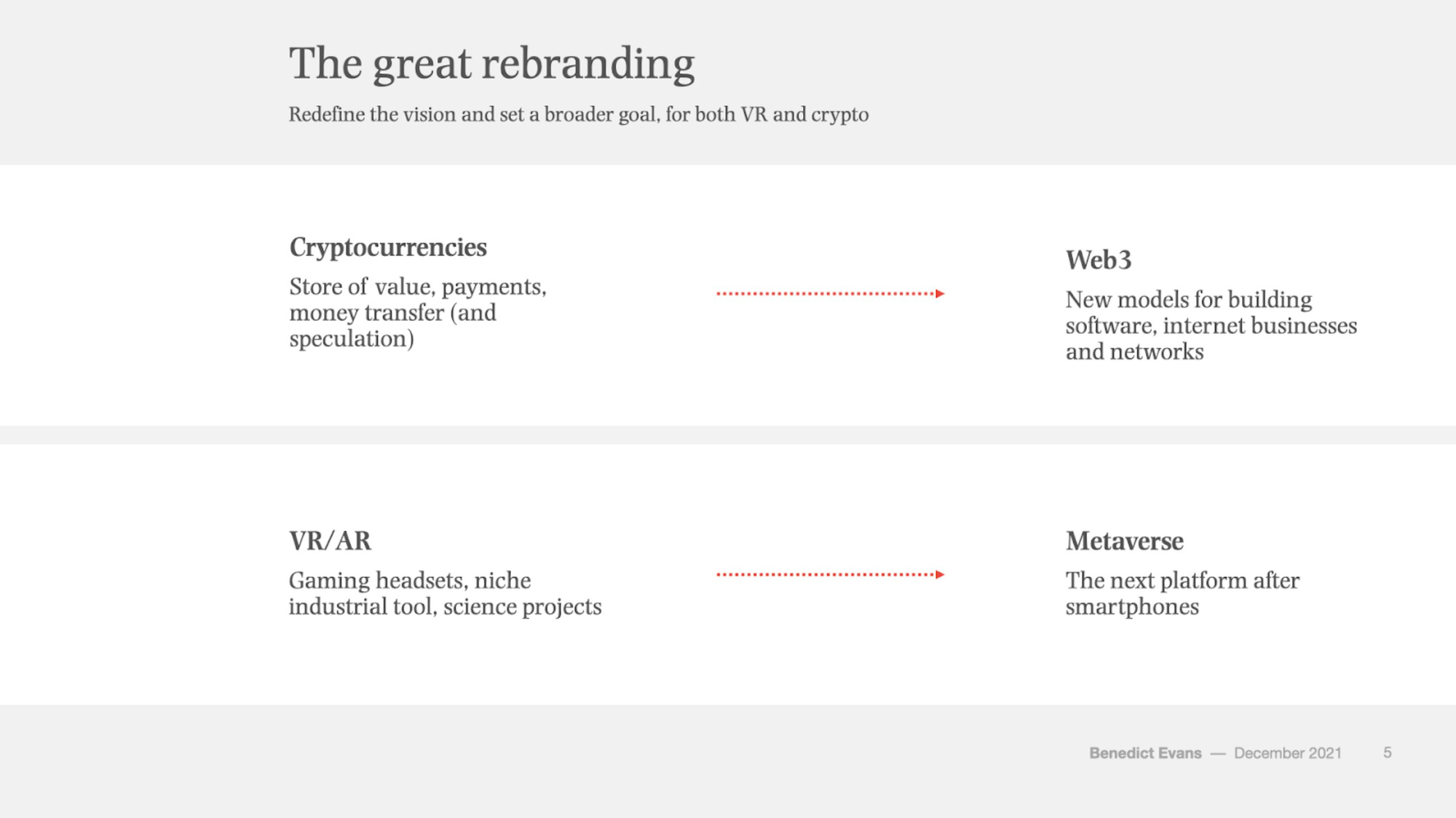 What was once VR/AR is now the Metaverse. Cryptocurrency is now Web3. One of Benedict Evans' slides in his presentation Three Steps into the Future deemed this The Great Rebranding.