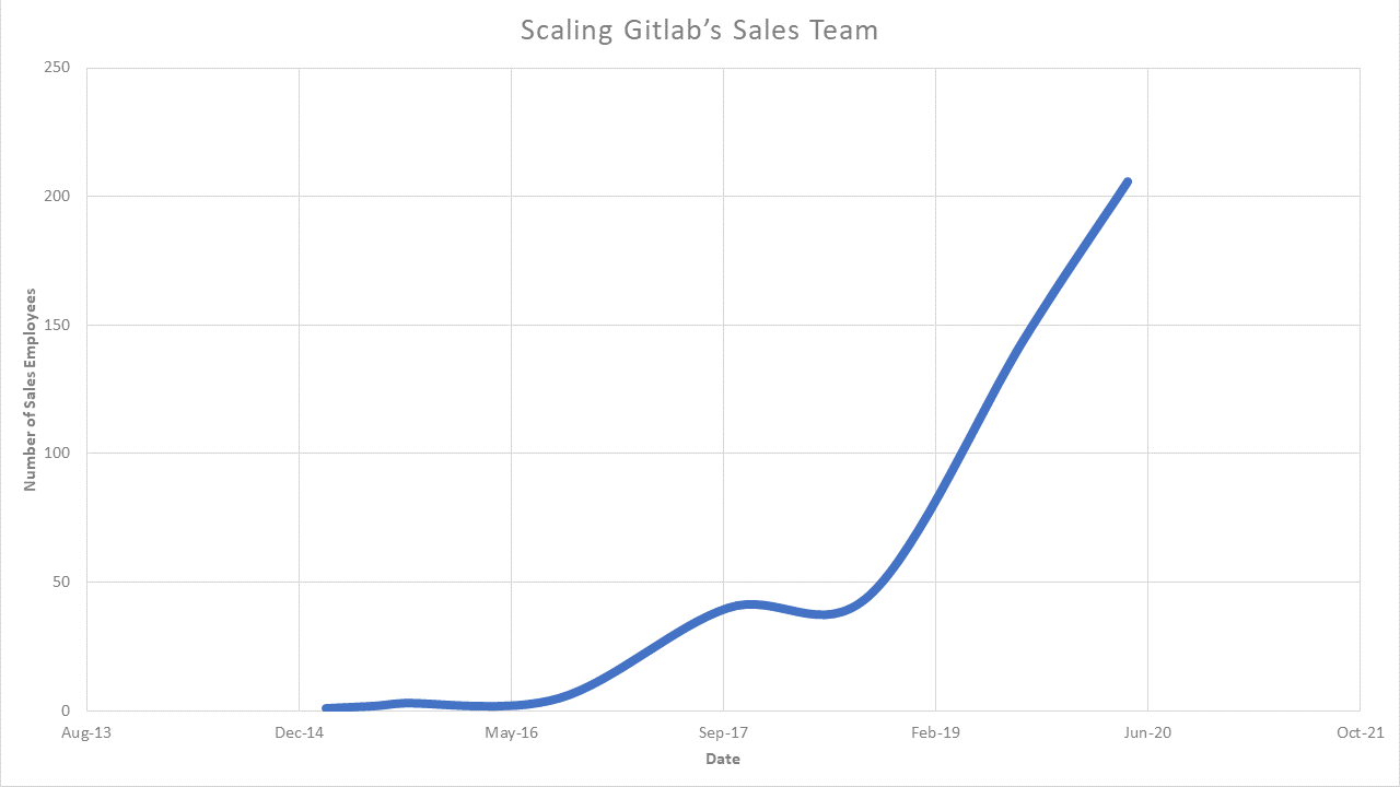 Even though this is a measure of sales organization size and our sales learning curve is sales yield, we can infer some information from this graph. From Dec 2014 to May 2016, you can see that Gitlab hired very few sales people as it was developing its product. The next wave of hiring came between May 2016 and September 2017, after the Series B. This is most likely when Gitlab moved to the transition phase. At around 50 employees, they were developing a repeatable sales model. Finally, you can see for the last year and a half, Gitlab has been hiring sales representatives as quickly as possible. Cross-referencing with the Gitlab open-source sales handbook, the organization has developed a playbook and resources to onboard new "coin-operated" representatives in a repeatable way, entering the execution phase.