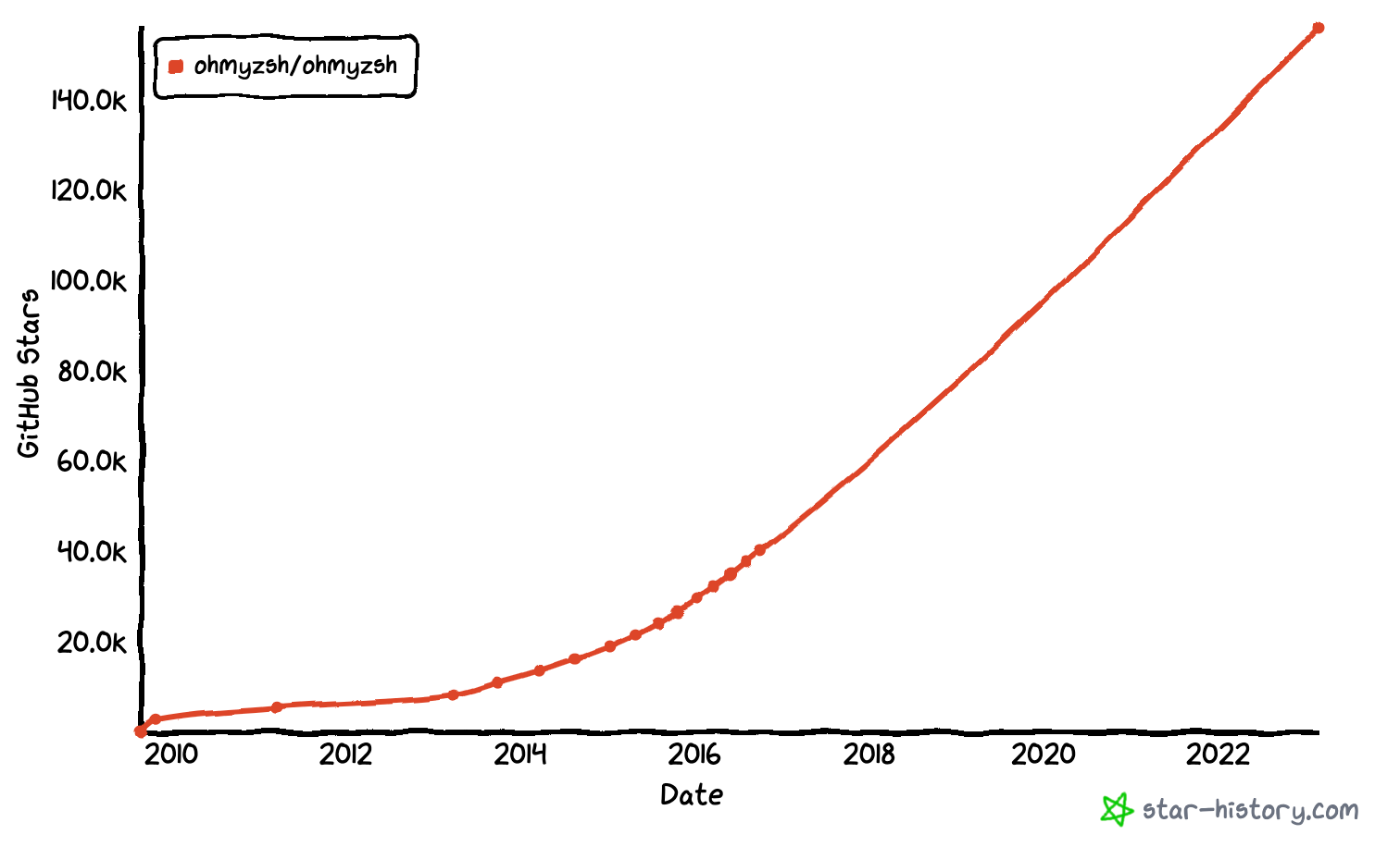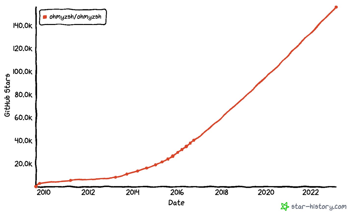 ohmyzsh is the 16th most-starred repository on GitHub (156,000 stars). I wish I had more granularity on this graph to see the inflection point where it was shipped by Apple.