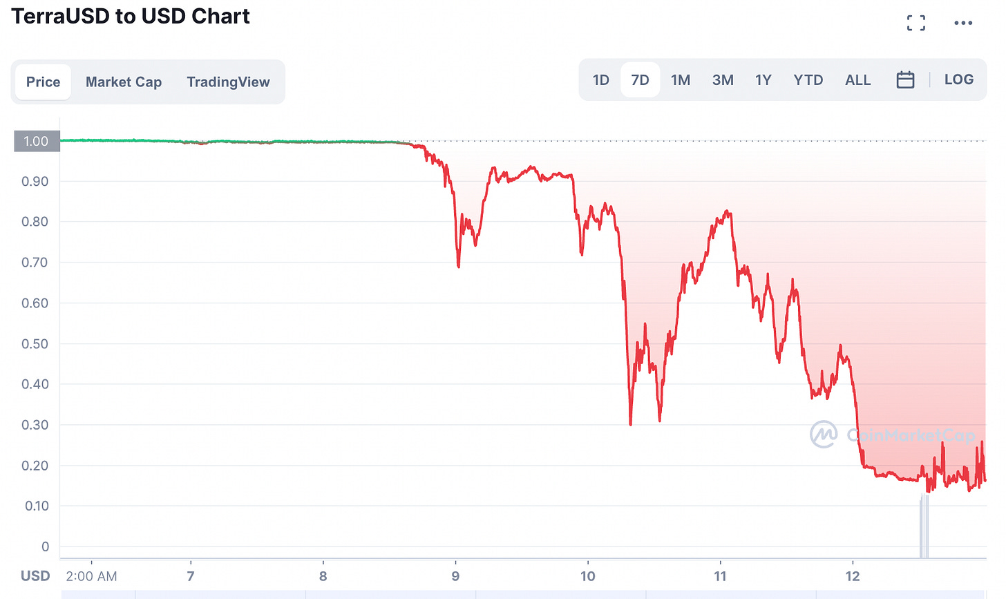 TerraUSD (UST) is an algorithmic stablecoin. It's meant to maintain a 1:1 fixed exchange rate (peg) with the U.S. Dollar. The theoretical price of UST should be $1. It's currently trading at $0.16. What happened?