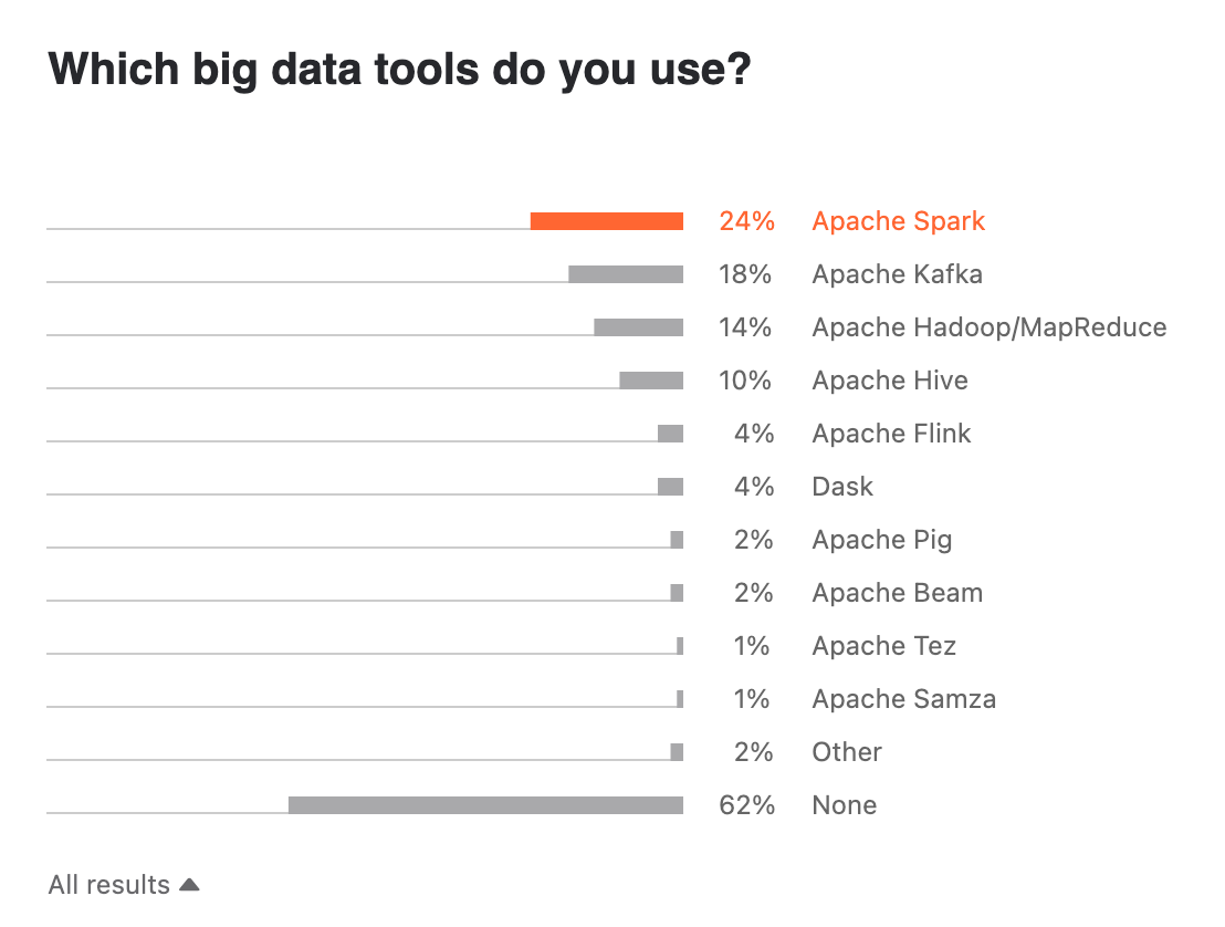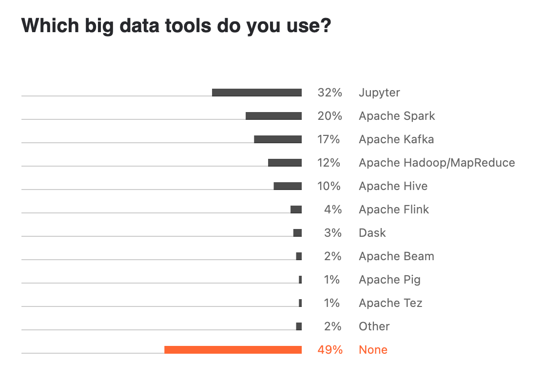 I would expect many of the Spark and Hadoop use cases to be better served by cloud-native solutions like Snowflake, BigQuery, and Kubernetes. Spark seems to be following this trend, but Hadoop is sticking around. It looks like streaming applications haven't found much use outside of Kafka.