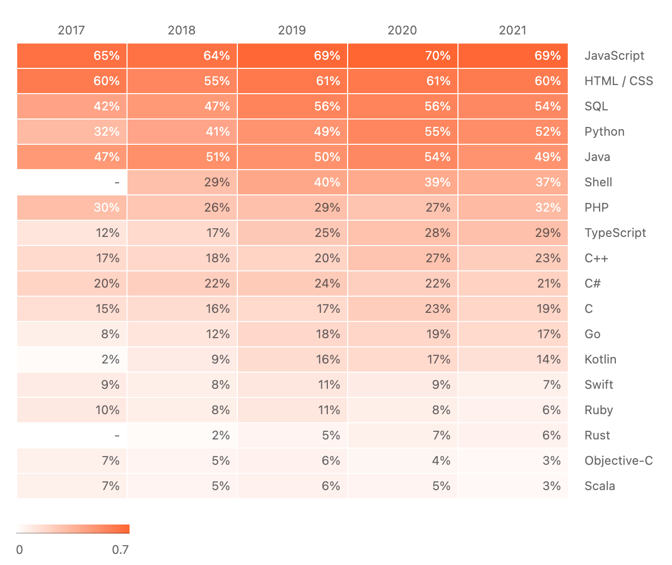 You can read the full report here. First, a heatmap of programming language popularity over the last few years – "What programming language have you used in the last 12 months".
