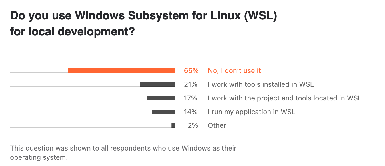WSL Penetration is much higher than I'd expect. 20% of Windows users are using WSL in some regard. That's pretty high, considering it still has many rough edges.