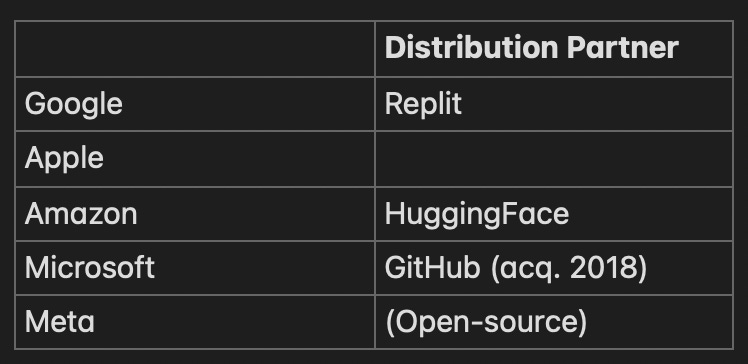 Distribution is all you need (right?). These companies defined distribution, so why would they need partners? While the field is still nascent, it’s essential to get the technology into the hands of the right people. That means (1) developers, (2) startups building the next big thing (3) and data scientists and machine learning practitioners. Startups that are hyper-focused on creating a dense community of these personas can beat the hyper-scaled companies that have to do everything. The partners can then access the foundational models and state-of-the-art research (e.g., OpenAI Codex / GitHub Copilot) to build differentiated products.
