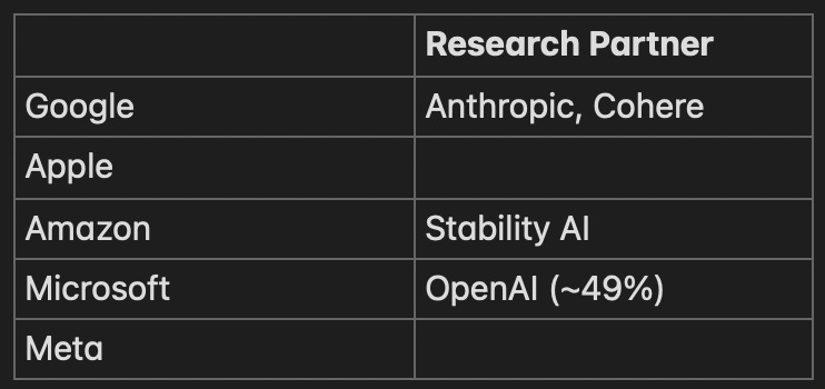 While all these companies have research organizations (Google researchers wrote the Transformers paper), there’s an inherent risk to productionizing these models. They could output incorrect, biased, or otherwise damaging information. They might train on the wrong data or bring up privacy concerns (a death sentence for companies already under intense public scrutiny). The startups gain some proprietary distribution for their models, but most importantly, access to the hardware and cloud resources they need to train foundational models.