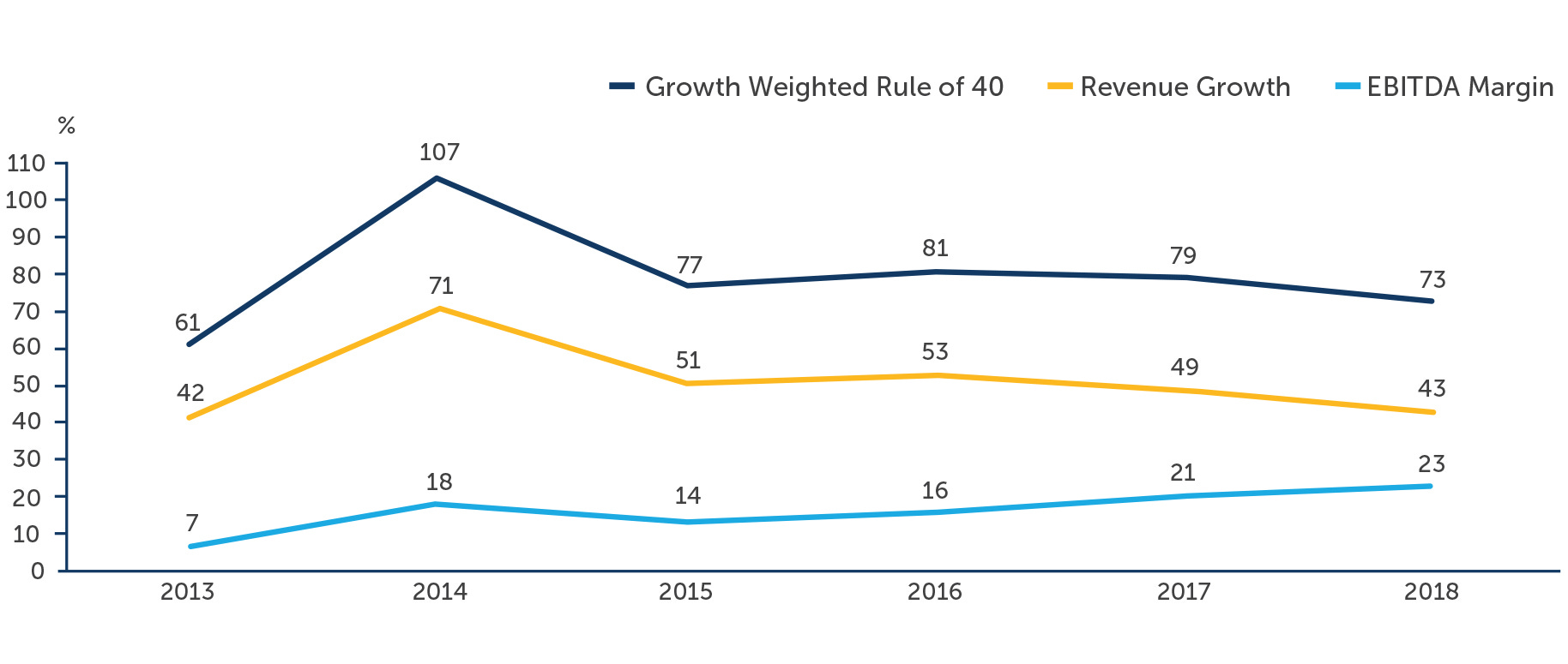 What's the benchmark? A good benchmark is that Growth Rate % + Profit Margin % > 40%, hence "the Rule of 40".