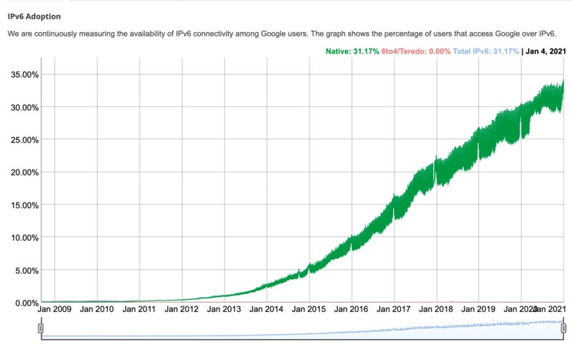 Luckily, there's existed a new standard for many years, IPv6, which is a 128-bit address space. That means it can hold 2128 addresses or 340 trillion IP addresses. But it's hard to get people to update their software to work with IPv6 addresses.
