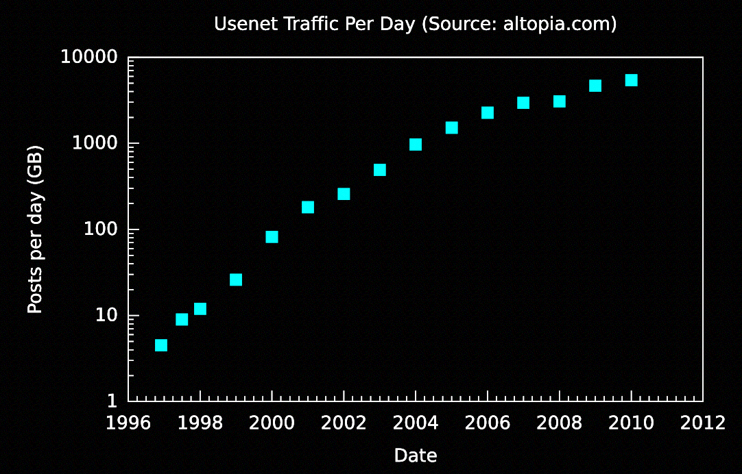 2I'm too young to have been a Usenet user in its peak form. By the time I had joined as a kid (late 90s), it had already migrated to the Internet and was a ghost town. Interestingly enough, traffic on Usenet continues to grow year over year.